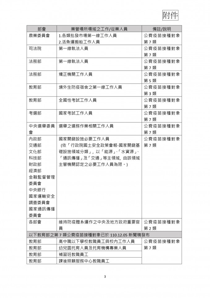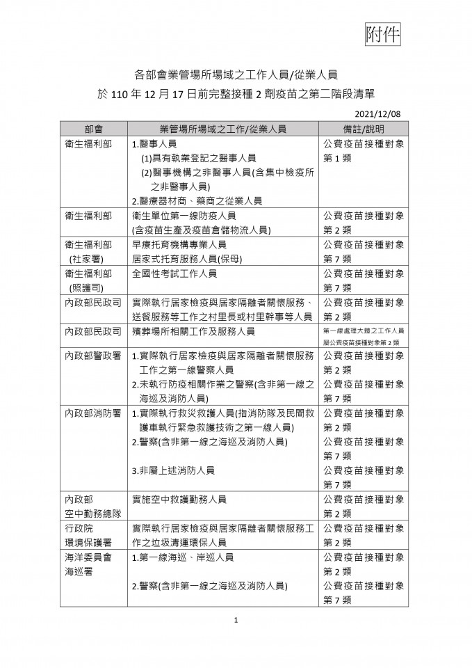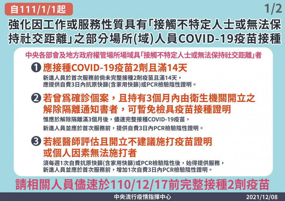 指揮中心強調,為確保相關場所場域人員自111年1月1日起皆能符合上開規範,各相關部會及地方政府將加強督導,請相關場所場域鼓勵未完整COVID-19疫苗接種之工作人員及從業人員,儘速於110年12月17日前完整接種2劑疫苗。